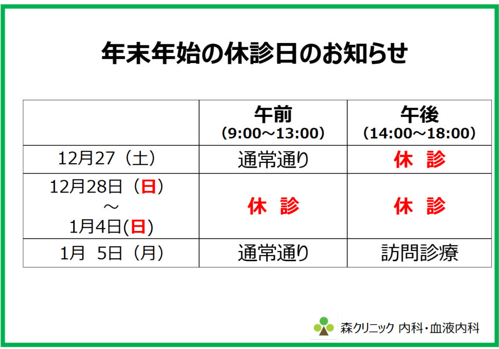 年末年始の休診日のお知らせ 2025-12-25 最終更新日時 : 2025-12-25 Administrator 年末年始について、以下のとおり休診とさせていただきます。 ご迷惑をおかけいたしますが、ご了承いただきますようお願い致します。